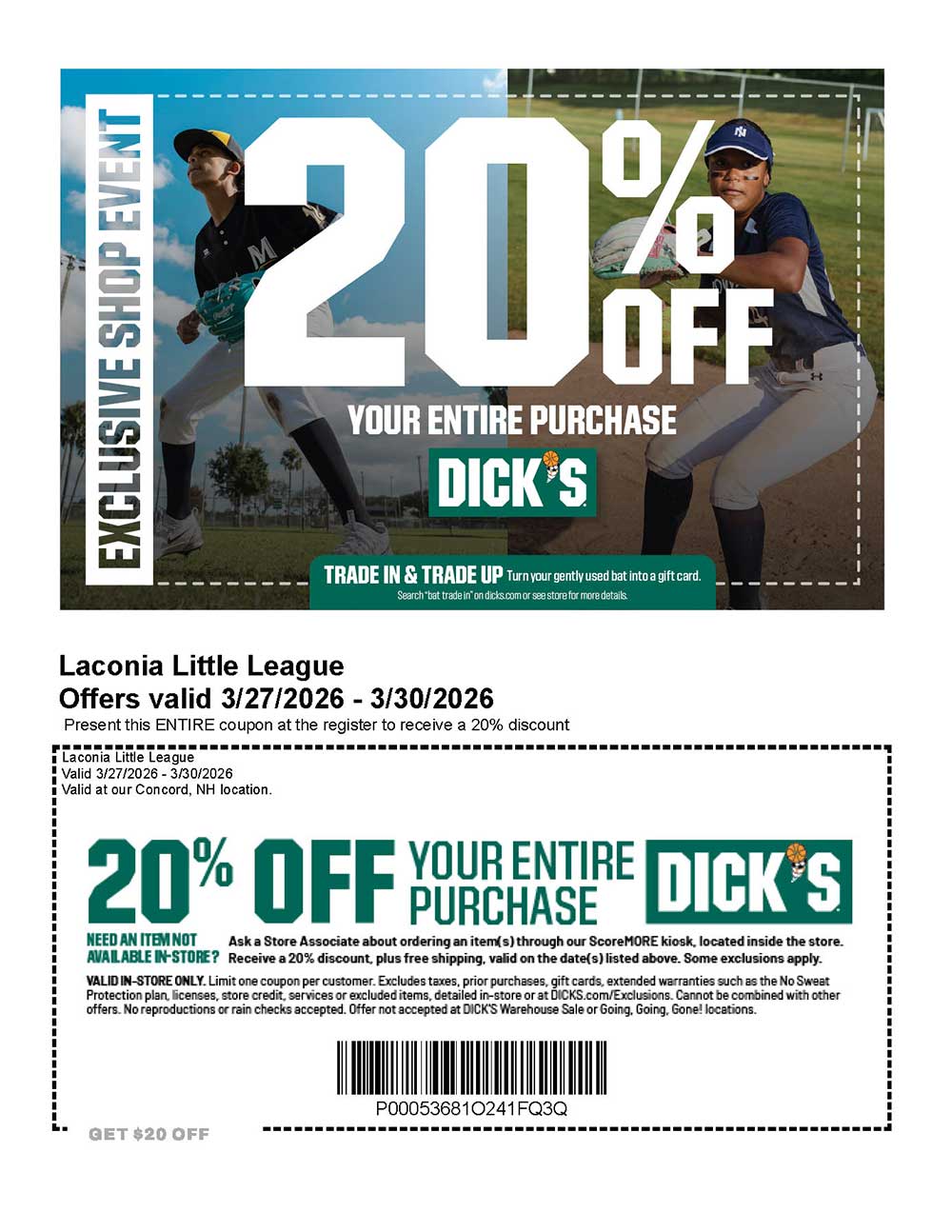 Laconia Little League families can save 20% off your entire purchase at the Concord DICK’S Sporting Goods from March 27 through March 30, 2026 with our league coupon.